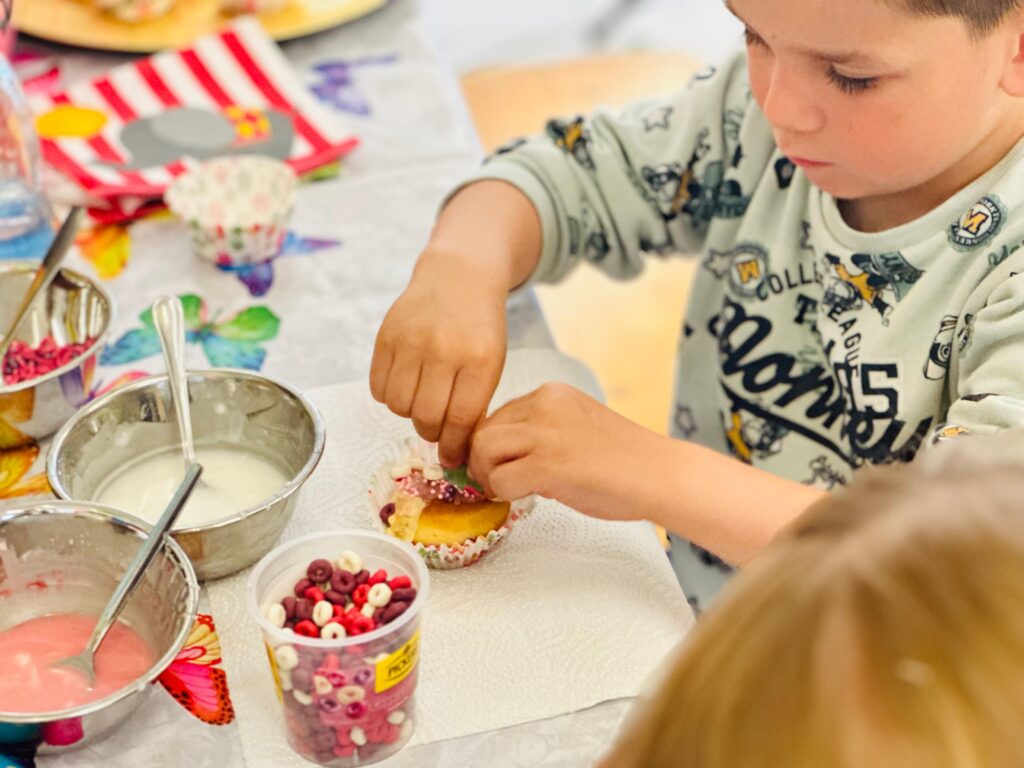 Die eigentliche Magie entsteht beim Verzieren: Mit bunten Streuseln, Schokolinsen, Gummibärchen, Marshmallows oder thematischen Dekoren gestalten die Teilnehmer individuelle Cupcake-Meisterwerke: